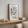 Nowoczesny plakat z botanicznym rysunkiem liści w stylu line art, uzupełniony abstrakcyjnymi kształtami w chłodnych odcieniach niebiesko-szarych. Delikatne linie, geometryczne tło i subtelny wzór kropek łącznik lekką, designerską kompozycję, która pasuje do wnętrz skandynawskich, japandi, rozkładych oraz. To dekoracja, która tworzy charakter, ale pozostaje spokojna i harmonijna.