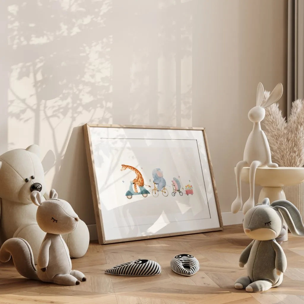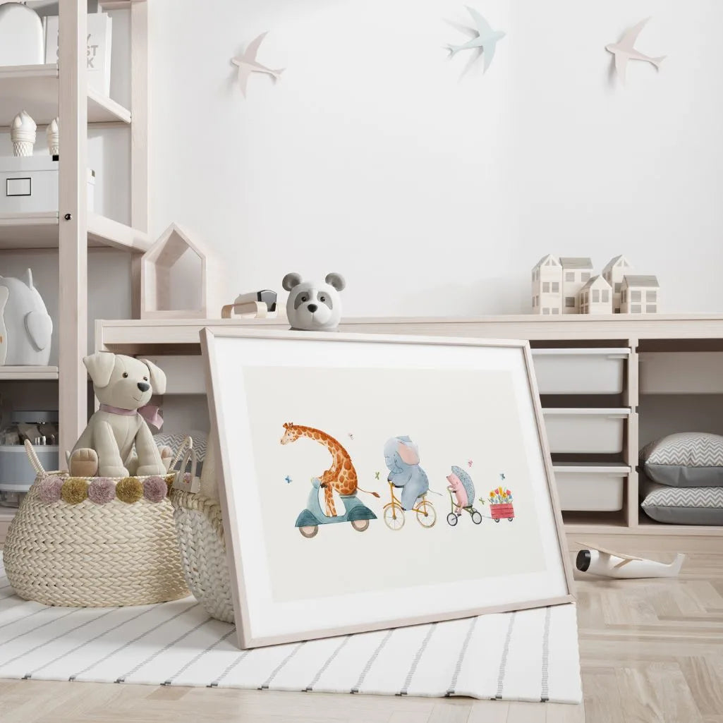Delikatny, akwarelowy plakat do pokoju dziecka z uroczą scenką: żyrafa na skuterze, słoń na rowerze i jeżyk na trójkołowcu ciągnący wózeczek z uroczymi kwiatami. Lekka, jasna konfiguracja z dużym wyposażeniem „oddechu” pięknie wygląda nad łóżkiemeczkiem, w zestawie zabaw albo w przedszkolu. Pastelowe kolory i bajkowy klimat stworzony przez mieszkanie, spokojne wnętrze.