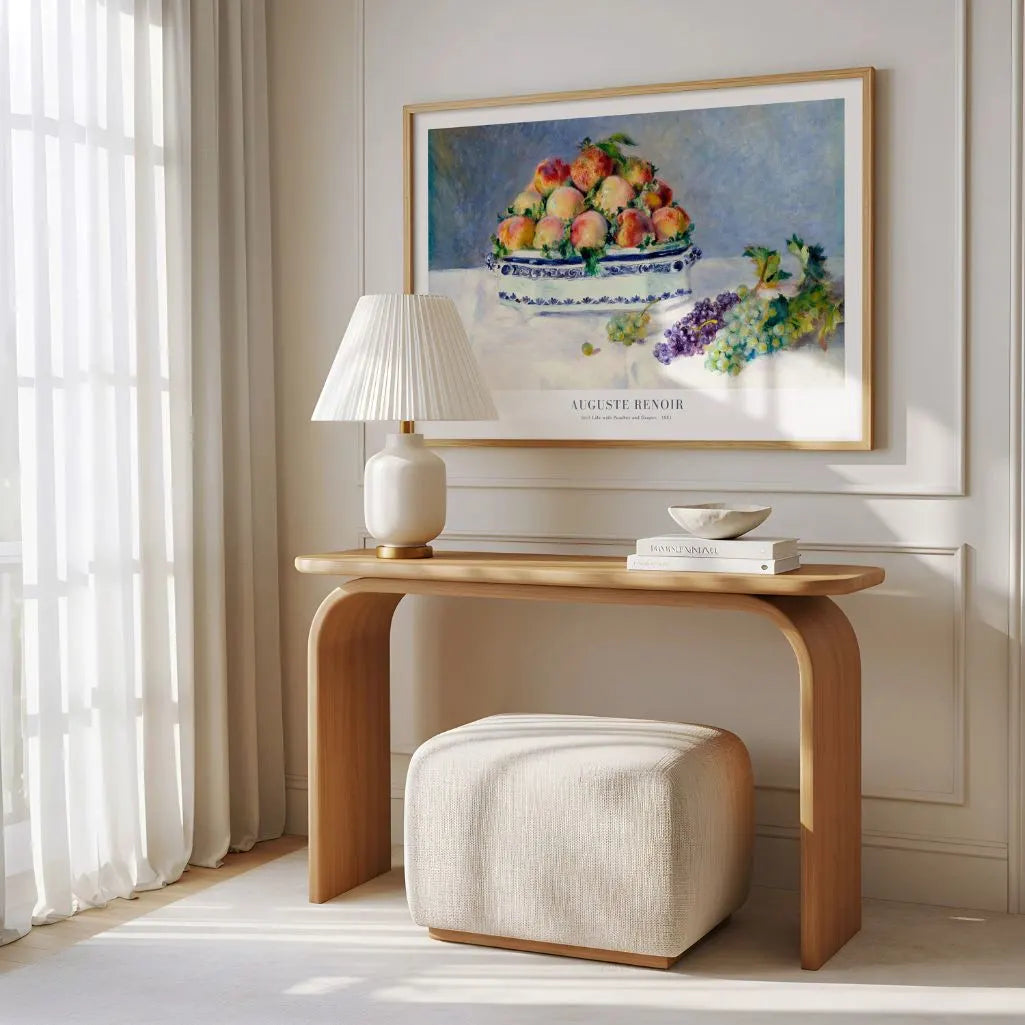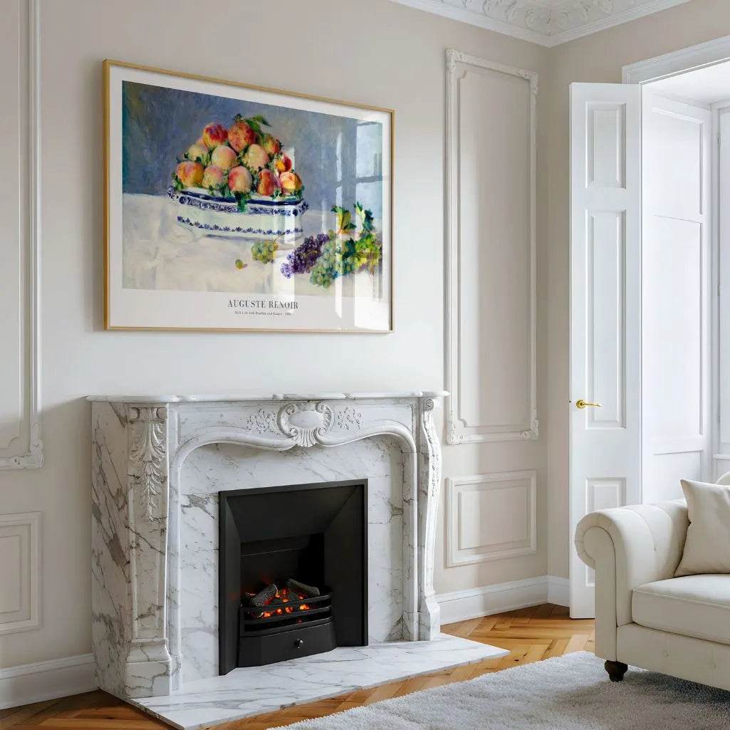 Plakat „Martwa natura z brzoskwiniami i winogronami” autorstwa Auguste Renoir to subtelny, wyrafinowany akcent do wnętrza. Miska dojrzałych owoców została namalowana miękką, impresjonistyczną fakturą pędzla, na pastelowym tle, co tworzy obraz ciepły, zmysłowy i dyskretnie luksusowy.