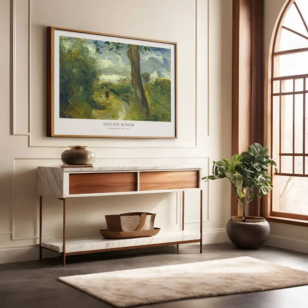 Plakat „Pejzaż między burzami” autorstwa Auguste Renoir ukazuje spokojny, ulotny moment po ulewie. Światło przebija się przez przesuwające się chmury i pada na krętą wiejską drogę, która prowadzi wzrok w głąb kompozycji. W oddali pojawia się mała sylwetka, dodając pejzażowi cichej, ludzkiej obecności.