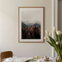 Ten elegancki plakat pochodzi z widoku ośnieżonych gór wyłaniających się zza prostychj mgły, z pierwszego planu dostępnych drzew w podwójnych, jesiennych odcieniach. Delikatne światło i naturalne kolory zapewniające spokojną, harmonijną kompozycję, która wprowadza do wnętrza atmosferę wyciszenia i kontakt z naturą. To fotografia idealna do skandynawskich zastosowań, świetnie sprawdzająca się w sklepie, sypialni czy przestrzeni kreatywnej.