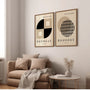 Ten zestaw plakatów Bauhaus przedstawia geometryczne kompozycje złożone z kół, półkoli oraz punktowych detali ułożonych w harmonijną strukturę.