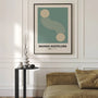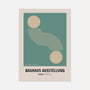 Ten plakat w stylu Bauhaus przedstawia dwie beżowe formy geometryczne połączone falującą linią, symbolizującą ruch i harmonię. Kompozycja w odcieniach zieleni i beżu wprowadza spokój, równowagę i nowoczesny rytm.
