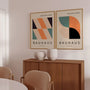 Proste formy i wyraźne linie nawiązują do estetyki szkoły Bauhaus, dzięki czemu plakaty stają się elegancką nowoczesną sztuką na ścianę.