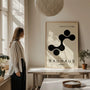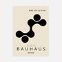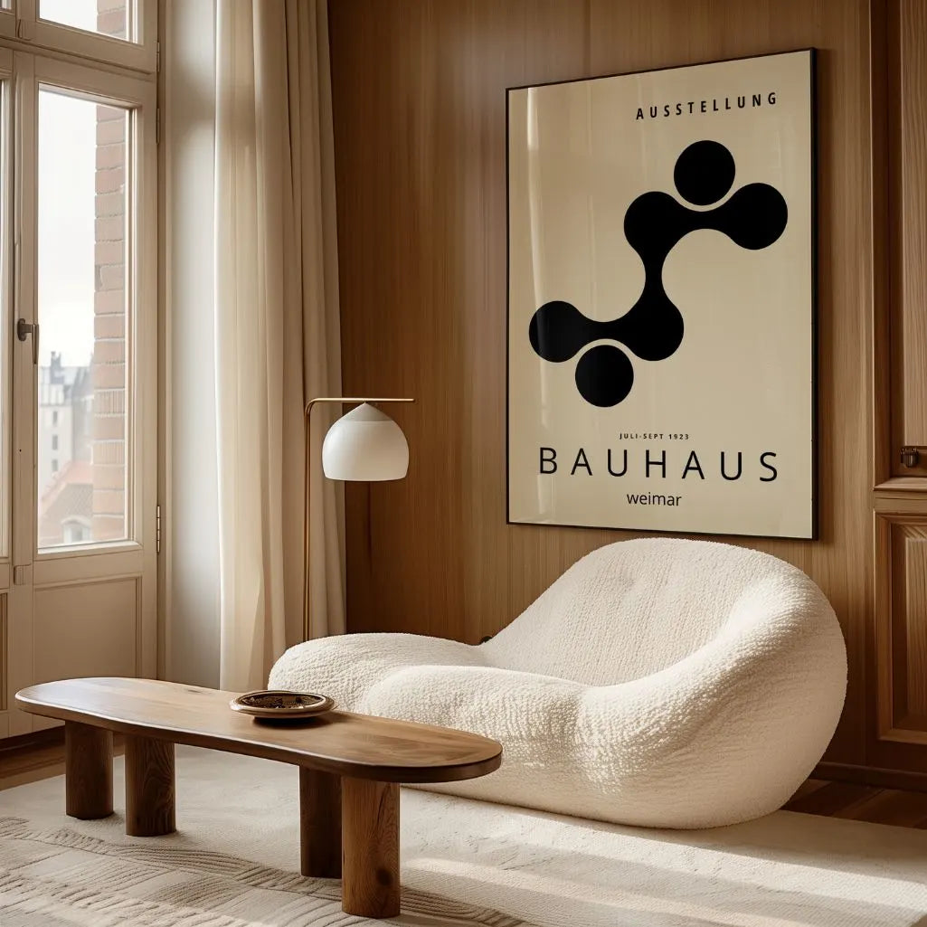 Zainspirowany modernizmem Bauhaus z 1923 roku, ten plakat przedstawia dynamiczny układ połączonych czarnych form, przywodzących na myśl struktury molekularne. Minimalistyczna kompozycja oddaje ideę Bauhausu o harmonii między naturą a geometrią — jest uporządkowana, zbalansowana i wyrazista, bez zbędnych elementów.