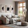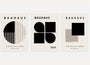 Zestaw wykorzystuje podstawowe figury modernizmu — koło, kwadrat oraz półokręgi — zestawione w surowych, klarownych kompozycjach. Kontrast zawarty w czerni, ukamienowany beżu i neutralnego tła stanowi wyrazistość, architektoniczną estetykę bez dekoracyjnego znaczeniau.
