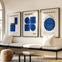 Plakaty Bauhaus – Zestaw 3 Sztuki „Granatowy Puls Weimar” do nowoczesnej kolekcji opartej na chłodnej kolorystyce i wyrazistej, modernistycznej formie. Zestaw wykorzystuje koła, półokręgi oraz proste moduły, które budują sieciowy, rytmiczny dialog między powierzchnią a kolorem.