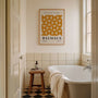 Ten plakat inspirowany Bauhausem wykorzystuje eleganckie złote, miodowe tony, aby oddać modernistyczną harmonię i porządek. Kompozycja oparta na rytmie jest spokojna i subtelnie hipnotyzująca — oszczędna w detalu, bogata w atmosferę, zaprojektowana tak, by wprowadzać równowagę na ścianie.