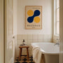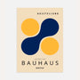 Ten plakat inspirowany Bauhausem przedstawia trzy jasne żółte koła zestawione z centralną granatową formą. Czysta modernistyczna kompozycja jest jednocześnie energetyczna i zrównoważona. Kontrast ciepłej żółci z chłodnym granatem nawiązuje do ponadczasowego dialogu światła i spokoju — jednej z najtrwalszych idei w projektowaniu geometrycznym.