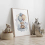 Delikatny akwarelowy plakat przedstawiający misję siedzącego na miękkim chmurzece, noszący się z trzema balonami – dwa w odcieniach błękitu z motywem gwiazdek oraz jeden w ciepłym beżu. Ilustracja ma lekki, bajkowy klimat i pastelową paletę, dzięki czemu stanowi idealne rozwiązanie do pokoju niemowlaka i małego dziecka. To normalne, subtelne obrazy , które dodają dystrybucji oryginalnej i harmonii, świetnie komponują się ze stylem skandynawskim, boho i minimalistycznym.
