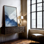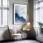 Plakat Górski Horyzont Blue przedstawia nastrojowy pejzaż gór spowitych delikatną, jasną mgłą. Połączenie głębokich granatów i chłodnych odcieni błękitu tworzy harmonijną, relaksującą kompozycję głęboko do wnętrz w stylu japandi, minimal, skandynawskim czy modern. Dziesięć subtelnych obrazów przestrzeni spokoju, głębi i elegancji – sprawdziło się w salonie, sypialni, przestrzeni do medytacji.