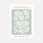 Delikatny plakat botaniczny w stylu abstrakcyjnym z jasnymi, dekoracyjnymi kwiatami na chłodnym, szałwiowo-miętowym tle. Uproszczone kształty elementów konstrukcyjnych, które wprowadzają kompozycję do wnętrza spokoju i świeżości. Stonowana paleta kolorów sprawia, że plakat pasuje do konfiguracji japońskiej, skandynawskiej, boho oraz minimalistycznej, a typograficzny układ dodaje efekt galeryjnej grafiki.