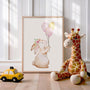 Delikatny, akwarelowy plakat z króliczkiem trzymającym pastelowe balony i kwiatową opaską do uroczej dekoracji do pokoju dziecka. Subtelne beże, pudrowy róż i żółć zapewniający spokojny, ciepły klimat – idealny do aranżacji w stylu boho, skandynawskim lub pastelowym. Te obrazy pięknie dopełnią krzesło dziecięce, pokój dziewczynki lub prezent na baby shower, urodziny czy chrzciny. Minimalistyczne tło sprawia, że plakat łatwo łączy się z innymi ilustracjami zwierzątek i plakatami do pokoju dziecięcego.