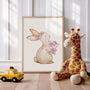 Uroczy, akwarelowy plakat z króliczkiem trzymającym różowe kwiaty do subtelnej dekoracji do pokoju dziecka. Pastelowe paski, podstawowe pociągnięcia pędzla i minimalne tłoki wprowadzające spokój oraz ciepło, dzięki czemu ilustracja jest dopasowana do funkcji boho, skandynawskiej i klasycznej. To idealne obrazy do dziecięcego pokoju, pokoju dziewczynki lub jako prezent na baby shower, urodziny czy chrzciny. Plakat pięknie układa się z innymi zwierzętakami w stylu akwareli i tworzy lekką, bajkową galerię na ścianie.