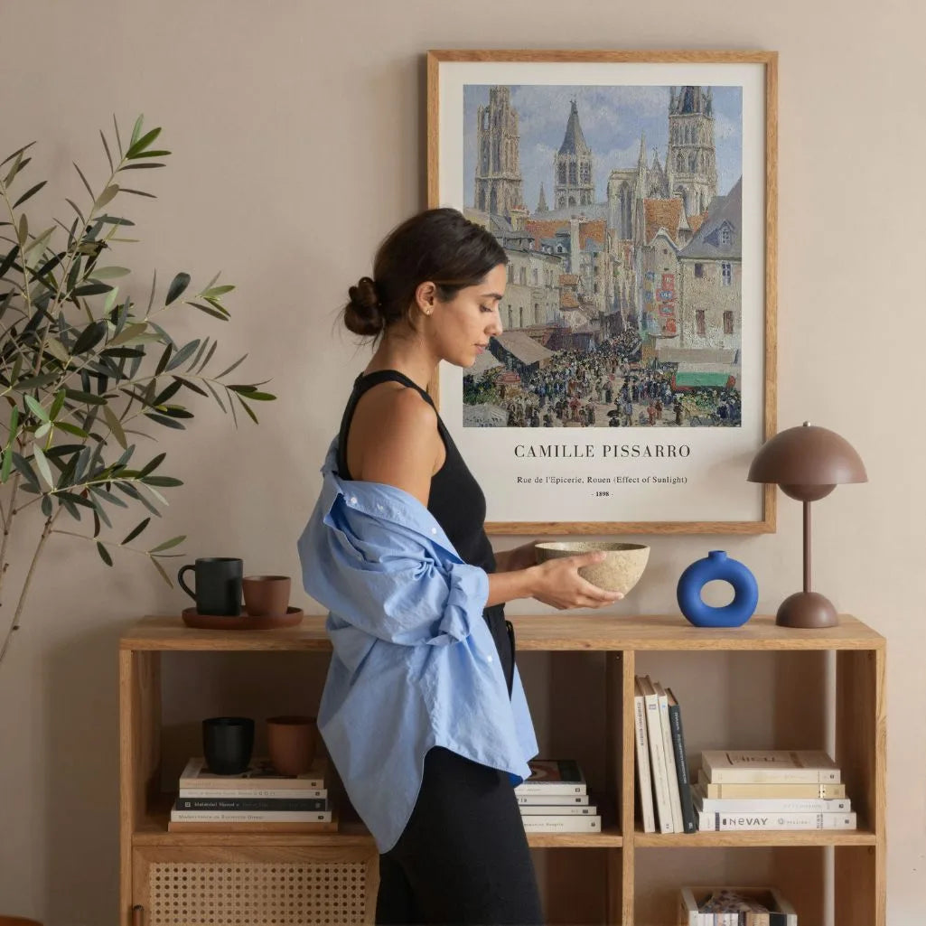Plakat Camille Pissarro „Rue de l'Épicerie, Rouen (Efekt światła słonecznego)” (1898) do kwintesencji impresjonistycznego miasta na miejskie życie do końca XIX wieku. Artysta uchwycił tętniącą ruch ulicę Rouen, oświetloną miękką, migoczącą światłem słonecznym. Przedstawione pociągnięcie pędzla, subtelna gra cieni i barwne refleksy działające na szkodę oraz ulotnego piękna chwili.