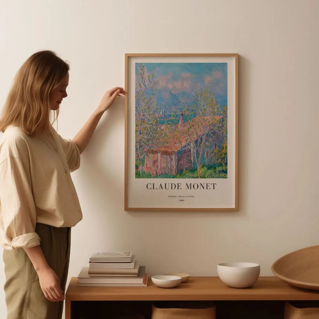 Plakat „Dom ogrodnika w Antibes (1888)” autorstwa Claude Monet oddaje atmosferę śródziemnomorskiego wybrzeża. Niewielki dom otoczony bujną roślinnością i kwitnącymi drzewami skrywa się wśród zieleni, a w oddali pojawia się pas błękitnego wybrzeża.