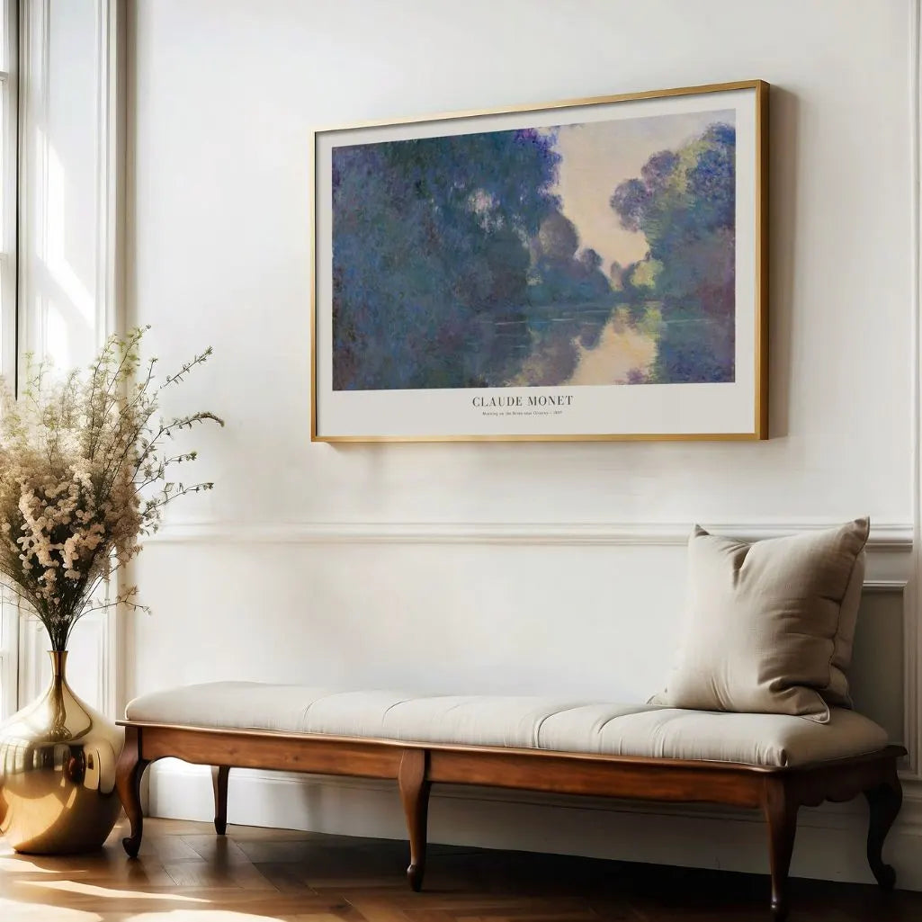 Plakat „Poranek nad Sekwaną w pobliżu Giverny” autorstwa Claude Monet wnosi do wnętrza poczucie cichego zachwytu. To późnoimpresjonistyczna scena o świcie, gdy pierwsze światło prześlizguje się przez mgłę i lśni na powierzchni wody.