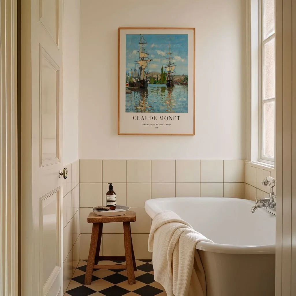 Plakat „Statki na Sekwanie w Rouen” autorstwa Claude Monet wprowadza do wnętrza harmonię i miękkie światło. Zacumowane łodzie spoczywają na spokojnej rzece, a poranne promienie tworzą subtelne odbicia i łagodne przejścia tonów na tafli wody.