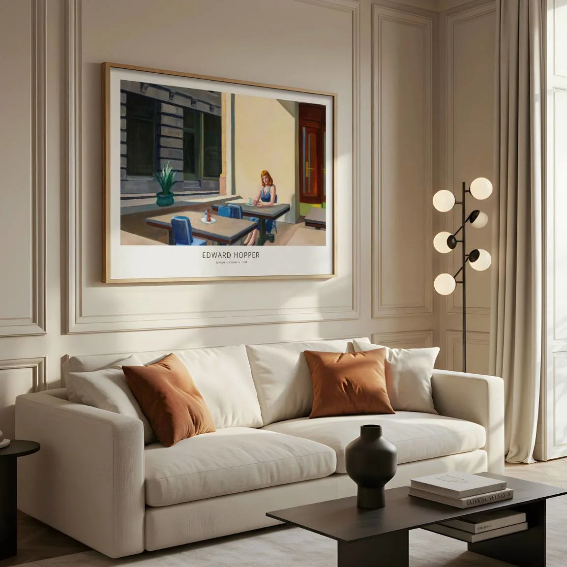 Ta reprodukcja w krajobrazie przedstawia samotną kobietę w pustej kawiarni, otoczona światłem poranka – scena, która jest oddawana charakterystyczny dla Hoppera ciszy ciszy, introspekcji i nadzoru w miejskim świecie.