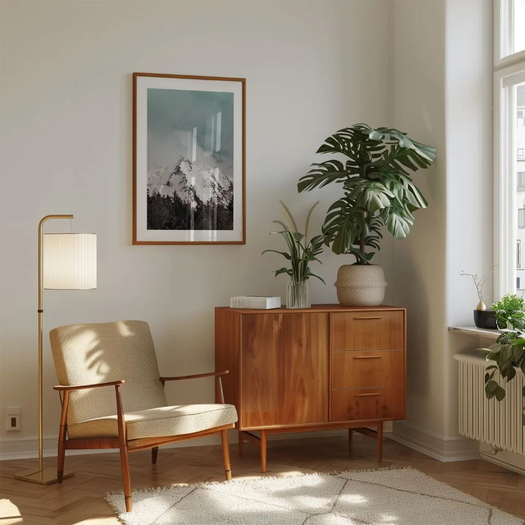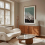 Ten elegancki plakat jest dostępny jako szczyt wynurzający się spod, szmaragdowych chmur. Kontrast pomiędzy jasną bielą śniegu a głęboką zielenią nieba tworzy kompozycję pełnego dramatyzmu, świeżości i pierwotnego majestatu. Dolna część zdjęć, wypełniona sylwetkami ciemnych drzew, dodaje całe głębi i harmonii. Idealna dekoracja wnętrz otwartych, skandynawskich, japandi czy loftowych — wprowadza spokój, przestrzeń i chłodną elegancję natury.