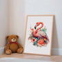 Akwarelowy plakat z flamingiem wykonanym z kwiatami, aby uzyskać efektowna, jednocześnie lekka dekoracja ścienna. Soczyste odcienie koralu i różu połączone z delikatną zielenią liściastą elegancką kompozycję, która pięknie ożywia wnętrze. To idealne obrazy do salonu, sypialni lub pokoju młodzieżowego – dopasowane do stylu boho, glamour i nowoczesnego minimalizmu. Ilustracja wygląda wspaniale solo, ale także w zestawie z innymi plakatami botanicznymi lub tropikalnymi.