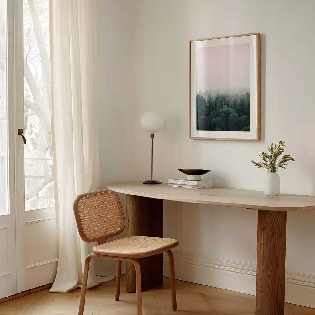 Dziesięć delikatnych, pełnych harmonii plakatów przedstawia gęsty, zielony las wybuchowy w delikatnyj, jasny mgle o pastelowym, różowawym niebie. Subtelna kompozycja łączy w sobie spokój, świeżość i minimalizm, tworząc pełną wyciszenia i czystość. Idealne do wnętrz skandynawskich, japandi, dostępne lub boho — dodaje im lekkości, przestrzeń i kontakt z naturą. To fotografia, która działa kojąco i wprowadza do specjalnego, sennego nastroju.