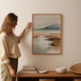 Plakat Golden Shore przedstawia delikatny, akwarelowy pejzaż inspirowany spokojnym wybrzeżem i mglistymi górami w tle. Ciepłe odcienie beżu i brązu harmonijnie połączenie się z chłodnymi szarościami, tworząc elegancką i relaksującą kompozycję. To idealna dekoracja do wnętrz w stylu skandynawskim, japandi, minimalistycznym czy rustykalnym. Plakat wprowadził do przestrzeni naturalne ciepło, subtelność oraz poczucie wyciszenia.