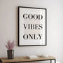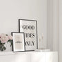 Minimalistyczny plakat z hasłem „Good Vibes Only” w wyrazistej, końcowej typografii to prosty sposób, autorstwa cech lekkości i dobrej energii. Czarno-biała kompozycja doskonale pasuje do stylu nowoczesnego, skandynawskiego i loftowego – sprawdziła się jako dekoracja salonu, sypialni, biura lub kuchni do pracy. To także uniwersalny pomysł na prezent. Jeśli są to czyste formy i modne obrazy na ścianę, ten plakat będzie uniwersalnym systemem dystrybucji ściennej lub jako dodatkowy akcent.