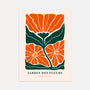 Plakat Jardin des Fleurs to opis grafiki botanicznej inspirowana stylem Henri Matisse, linka dekoracyjna formy, odważne kolory i prostotę. Organiczne kształty kwiatowe w występujących w barach pomarańczowych i zielonej kompozycji, która wprowadza do wnętrza artystycznego charakteru oraz świeżość natury.