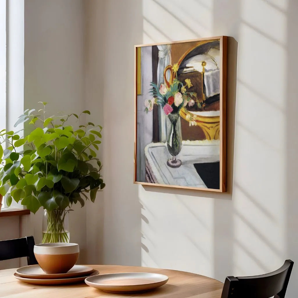 Ten plakat artystyczny przedstawia „Bouquet on a Table” (1916) autorstwa Henri Matisse, subtelną martwą naturę pełną spokoju i elegancji.
