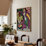 Zmysłowe linie, ornamenty oraz intensywne kontrasty barw nadają scenie elegancję i rytmiczną energię. Obraz przyciąga uwagę i wprowadza do wnętrza wyrafinowany artystyczny charakter.