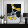 Delikatne kwiaty w szklanym wazonie zestawiono z intensywnymi cytrynami, białą tkaniną i głębokim czarnym tłem. Dzięki temu obraz zyskuje elegancję, światło i wyraźną wizualną głębię.