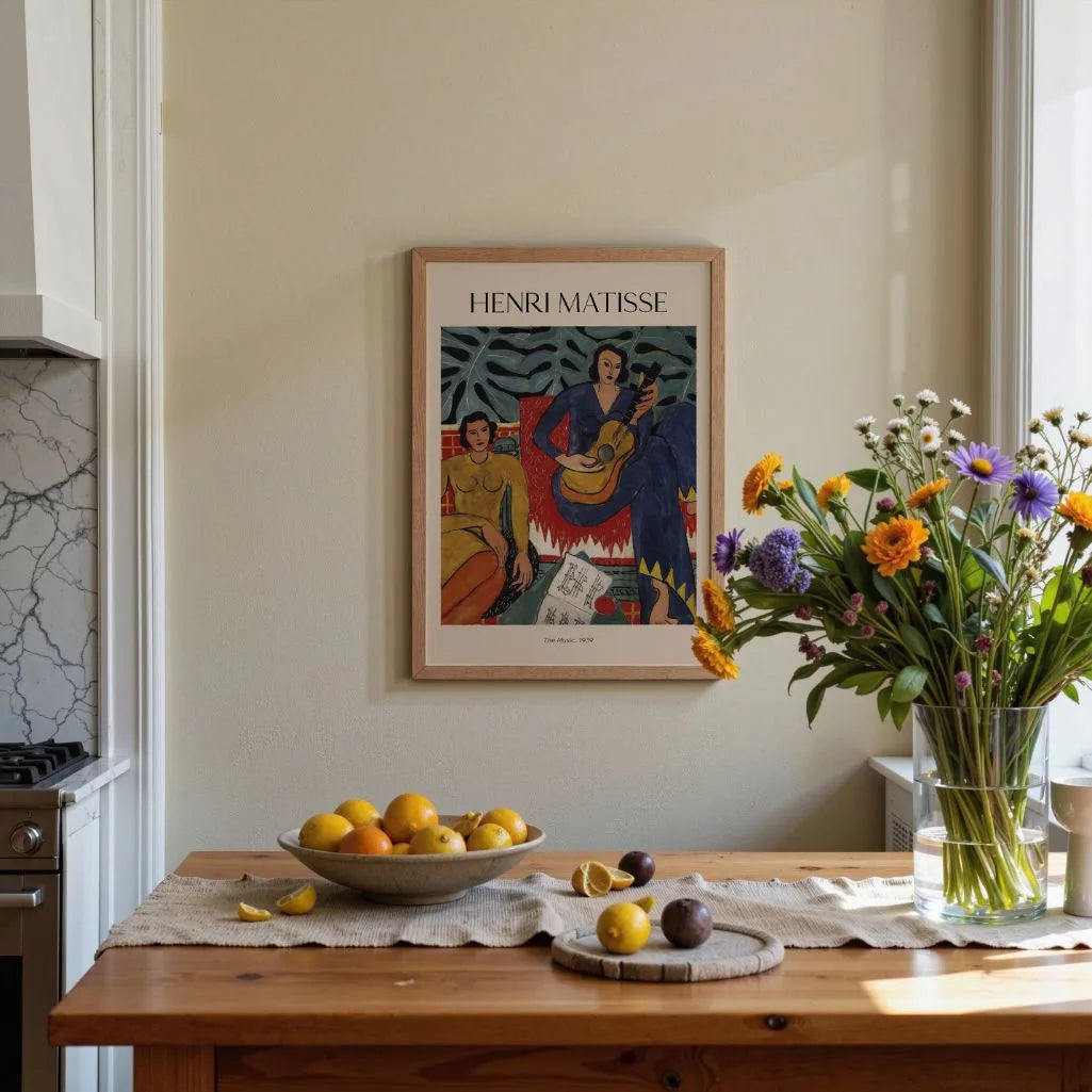 Ten plakat przedstawia „The Music” (1939) Henri Matisse, spokojną scenę, w której dwie kobiety są całkowicie pochłonięte muzyką i twórczą kontemplacją. Uproszczone formy i intensywne kolory tworzą kompozycję opartą na rytmie i równowadze.