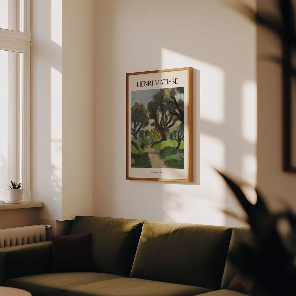 Ten plakat przedstawia „Landscape” (1918) autorstwa Henriego Matisse’a — wyciszoną kompozycję pejzażową utrzymaną w łagodnych, stonowanych barwach. Płynne linie drzew, wijąca się ścieżka i miękkie światło tworzą atmosferę spokoju, równowagi i ciepłej subtelności.