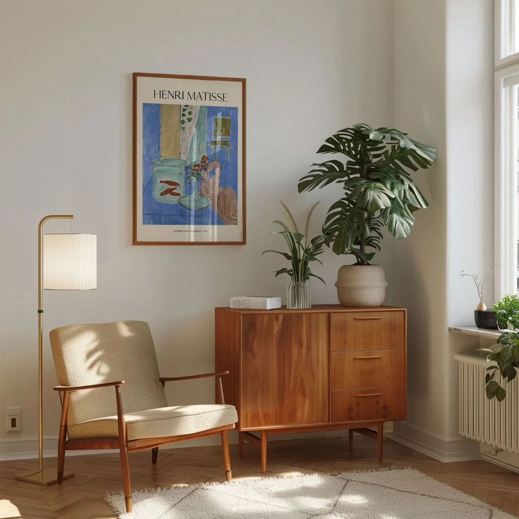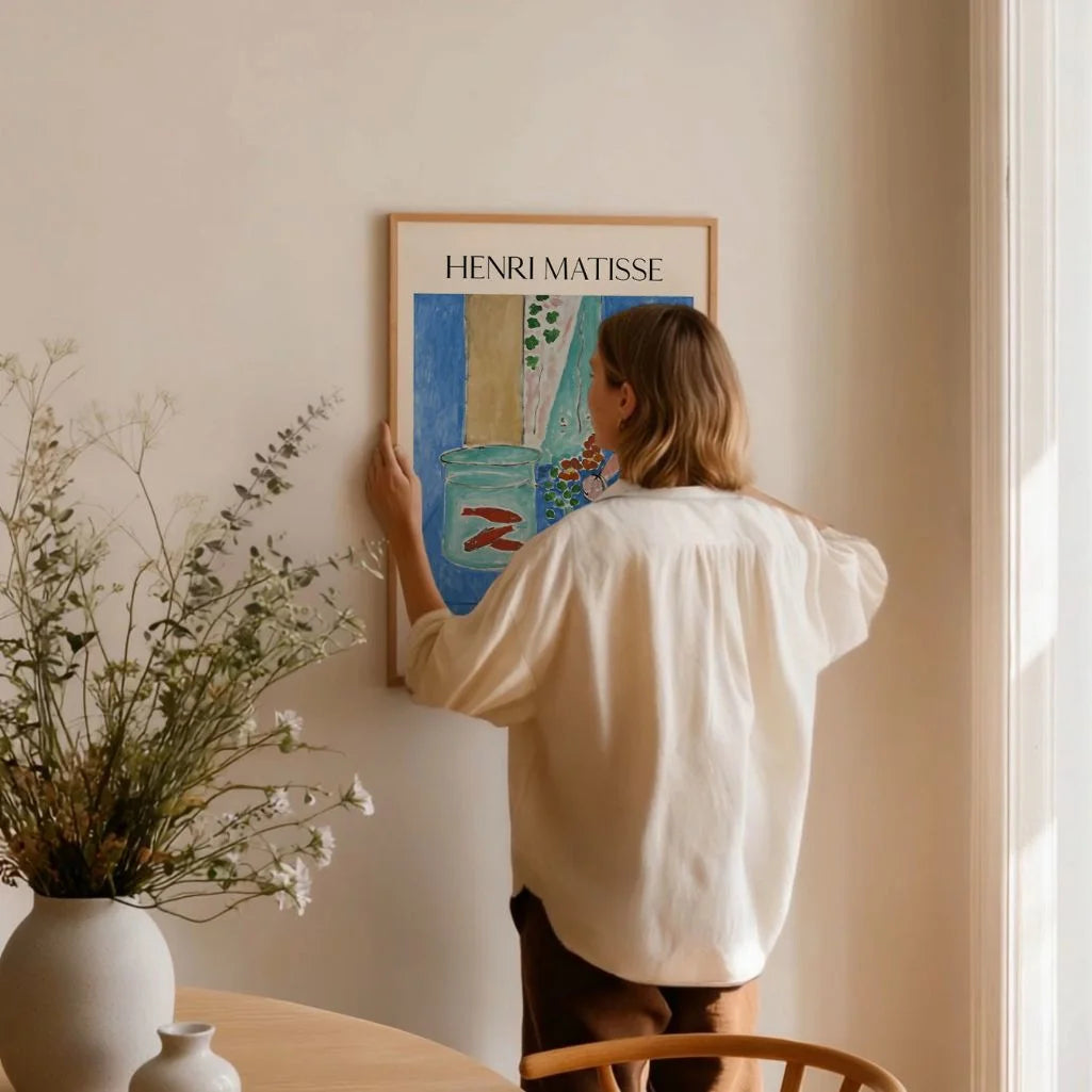 Ten plakat przedstawia dzieło „Goldfish and Sculpture” (1912) autorstwa Henriego Matisse’a – jedną z najbardziej rozpoznawalnych martwych natur modernizmu. Złote rybki w szklanej misie, zestawione z rzeźbą i uproszczonymi formami, tworzą kompozycję pełną rytmu, koloru i harmonii.