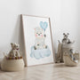 Uroczy plakat w stylu akwareli przedstawia owieczkę siedzącą na chmurze i trzymającą balon w obudowie serca. To lekkie obrazy do pokoju dziecięcego, które wprowadzają spokój, ciepło i bajkowy klimat. Pastelowy błękit i jasne, jasne tony, które można zastosować do pokoju niemowlaka, przedszkolaka oraz do aranżacji skandynawskich, boho i minimalistycznych. Plakat pięknie wygląda nad łóżeczkiem, komodą lub w galerii ściennej z innymi zwierzętami. Idealny także jako prezent na baby shower, narodziny, chrzest lub roczek.