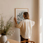 Nowoczesny plakat linkowy botaniczny rysunek liści w stylu line art z abstrakcyjnymi, ukrytymi formami i delikatnym rozwiązaniem kropek. Stonowana paleta (beż, czerń i chłodny niebiesko-szary) sprawia, że dekoracja wygląda lekko, designersko i bardzo uniwersalnie. To idealny wybór do wnętrz skandynawskich, japandi, ograniczonych oraz — doda charakteru, nie przytłaczając przestrzeni.