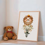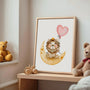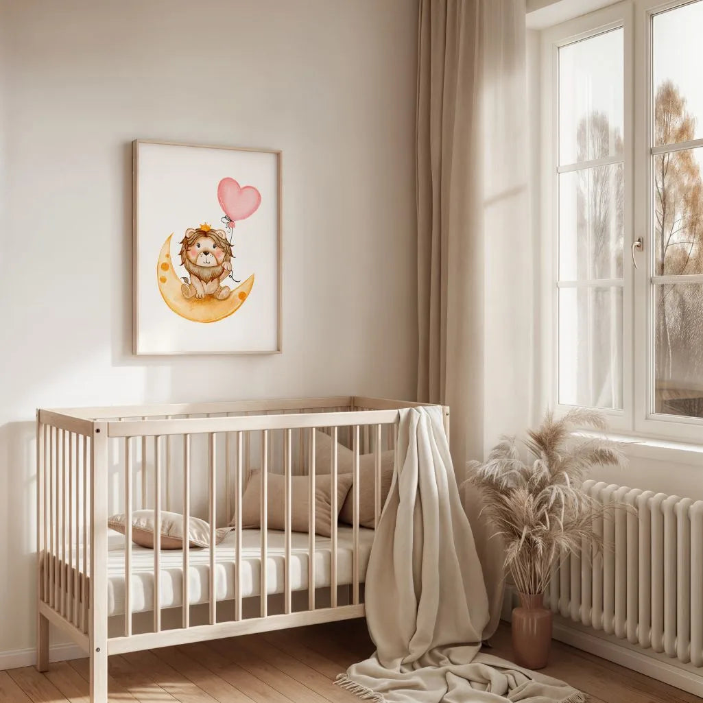 Delikatny, akwarelowy plakat dla dzieci przedstawiający przestępstwa lwiątka w koronie siedzącego na złotym księżycu i wykorzystującego różowy balonik w rodzinie. Pastelowe kolory, dużo jasnej przestrzeni i bajkowy klimat powodujący, że te obrazy pięknie rozpraszają wnętrze i świetnie powstają w pokoju niemowlaka lub przedszkolaka. Idealna jako dekoracja nad łóżkiem, do mebli do czytania albo jako prezent na baby shower. Plakat łatwo podłączony z innymi ilustracjami w stylu safari, chmurami i motywem nieba.