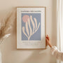 Ten plakat inspirowany Henri Matisse’em prezentuje elegancką, minimalistyczną kompozycję nawiązującą do estetyki jego ikonicznych wycinanek. Delikatny błękit łączy się z pudrowym różem i kremową bielą, tworząc dekorację ścienną spokojną, lekką i dyskretnie wyrafinowaną.