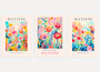 Kompozycje przedstawiają bogaty, stylizowany ogród pełen roślin o miękkich, malarskich kształtach. Intensywne odcienie różu, czerwieni, żółci i błękitu przenikają się na jasnym tle, tworząc lekką, radosną i harmonijną całość. Ilustracyjny charakter nadaje się do zastosowania dekoracyjnego, niemal poetyckiego wymiaru.