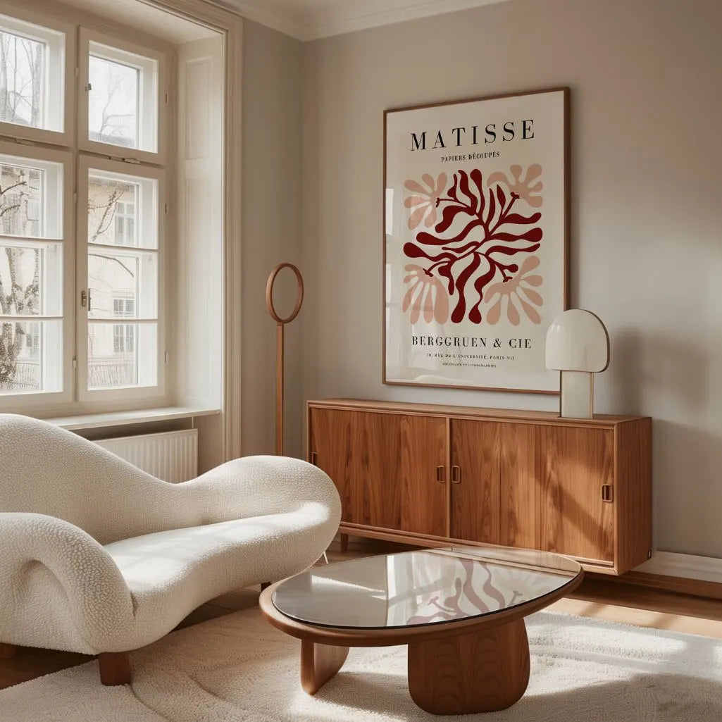 Ten plakat inspirowany Matisse’em to dopracowana interpretacja estetyki wycinanek. Delikatne, organiczne formy w ciepłych tonach tworzą wyważoną kompozycję, w której bordowy kolor buduje głębię i ponadczasową elegancję.