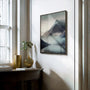 Duży plakat przedstawiający majestatyczny, warstwy ułożone w górę spowite gęstą mgłą, odbijające się w zwykłej tafli jeziora. Subtelna paleta chłodnych szarości, zieleń i błękitów tworzą harmonijny, kojący klimat, idealny do wnętrz w stylu skandynawskim, japandi, modern lub minimalistycznym. Ten obraz przestrzeni głębi, wolności i istoty ludzkiej — idealnego do salonu, sypialni, biura lub gabinetu.
