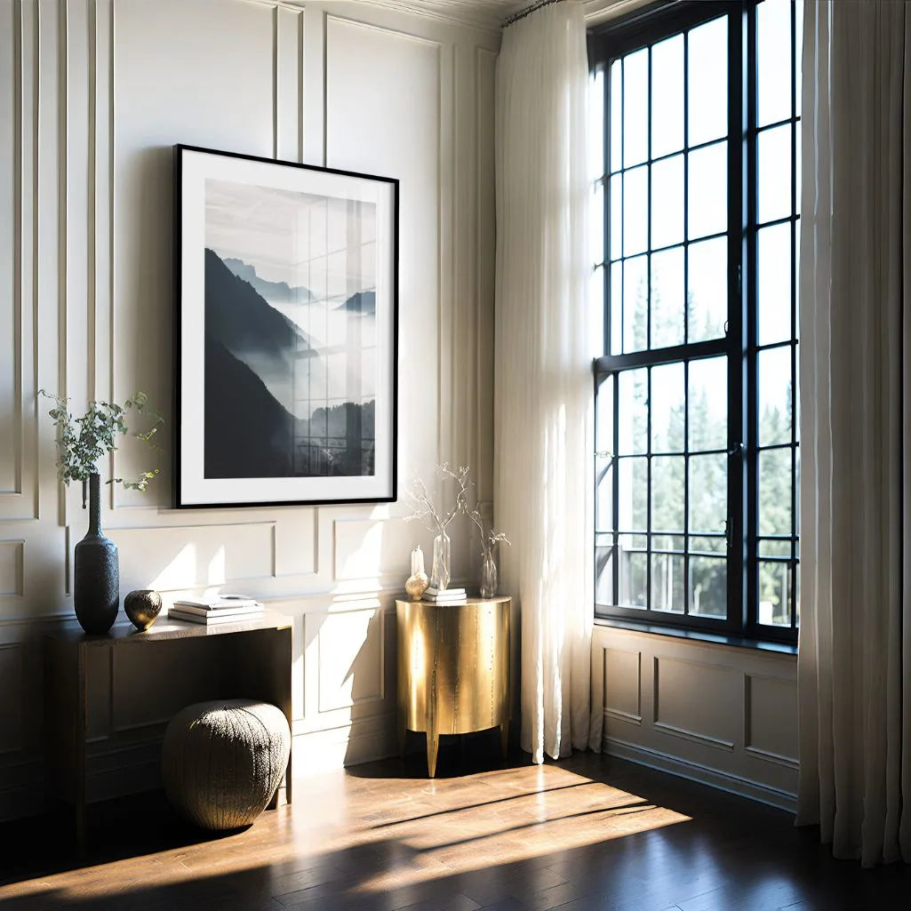 Ten nastrojowy plakat przedstawia opadające, warstwowo ułożone doliny górskie, deszczowe w gęstej, eterycznej mgle. Miękkie światło przenikające przez chmury tworzy subtelne przejścia tonalne, kształtujące się zboczy i dające głębiny oraz spokój. To idealny wybór dla zwykłego minimalizmu, natury oraz wnętrz inspirowanych stylami skandynawskimi, japandi lub świeżym. Fotografia wprowadza do przestrzeni harmonię, ciszę oraz dostęp do przestrzeni kosmicznej.