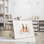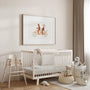 Uroczy plakat dziecięcy z ilustracją dwóch małpek jeżdżących na elektrycznym rowerze tandem. Lekka, akwarelowa stylistyka i ciepłe kolory modułu klimatyzacyjnego, który rozjaśnia wnętrze i ekran. To idealna dekoracja do pokoju dziecięcego, klasy zabaw lub przedszkola — dopasowania do skandynawskich, boho oraz neutralnych, pastelowych przestrzeni.