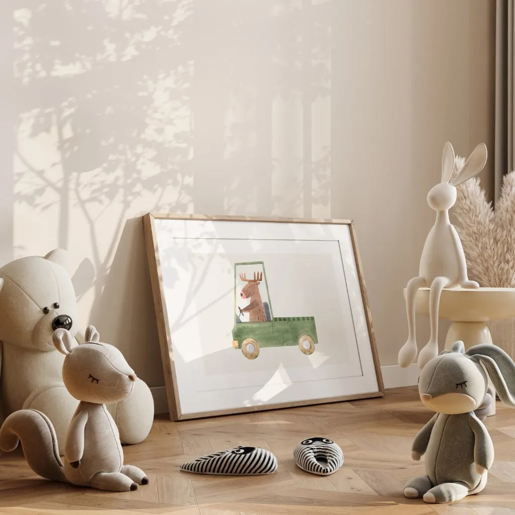 Przytulny plakat dziecięcy z akwarelową ilustracją łosia dostarczago ciężarówkę. Minimalistyczna konfiguracja, rozkład kolorów i bajkowy charakter, że dekoracja jest doskonale dopasowana do pokoju dziecięcego, wyposażenia zabaw oraz przedszkola. Ten wspaniały motyw odnajdzie się w aranżacjach skandynawskich, boho i neutralnych wnętrzach, dodając im ciepła i uśmiechu.