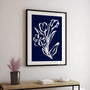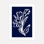Plakat „Kwiatowy Line Art Granatowy Minimalizm” przedstawia białą, szkicowaną kompozycję roślinną na głębokim granatowym tle. Prosty, odręczny rysunek, nadający ilustrację elegancji i nowoczesnego charakteru, tworzący wyraziste obrazy idealne do wnętrz w stylu minimalistycznym, skandynawskim oraz modern classic. Ten plakat świetnie ożywi salon, sypialnię lub pracownię, dodając im ponadczasową estetyki.