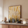 Obraz na płótnie w ramie „Japanese Gold Garden” nawiązuje do tradycyjnej japońskiej sztuki botanicznej. Smukłe rośliny i delikatne linie tworzą rytmiczny, wyważony układ o poetyckim charakterze.