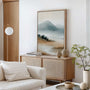 Wysokiej jakości druk oddaje fakturę akwareli i płynność barw. Elegancka rama podkreśla minimalistyczny charakter dzieła, idealnego do wnętrz japandi, skandynawskich i nowoczesnych.