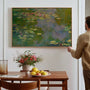 Ten obraz na płótnie w ramie przedstawia „Water Lilies” (1919) autorstwa Claude Monet, należący do słynnej serii z Giverny. Kompozycja skupia się wyłącznie na powierzchni wody, bez horyzontu i nieba.