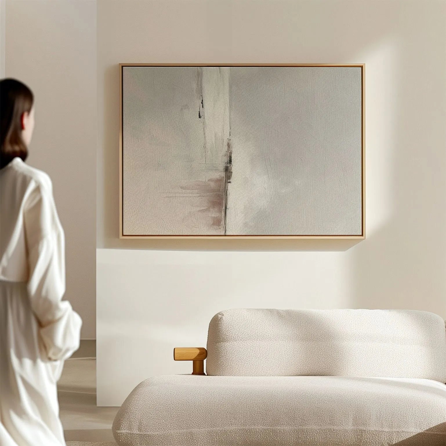 Obraz na płótnie w ramie doskonale komponuje się z wnętrzami japandi, scandi i nowoczesnymi naturalnymi, wprowadzając spokojną elegancję.